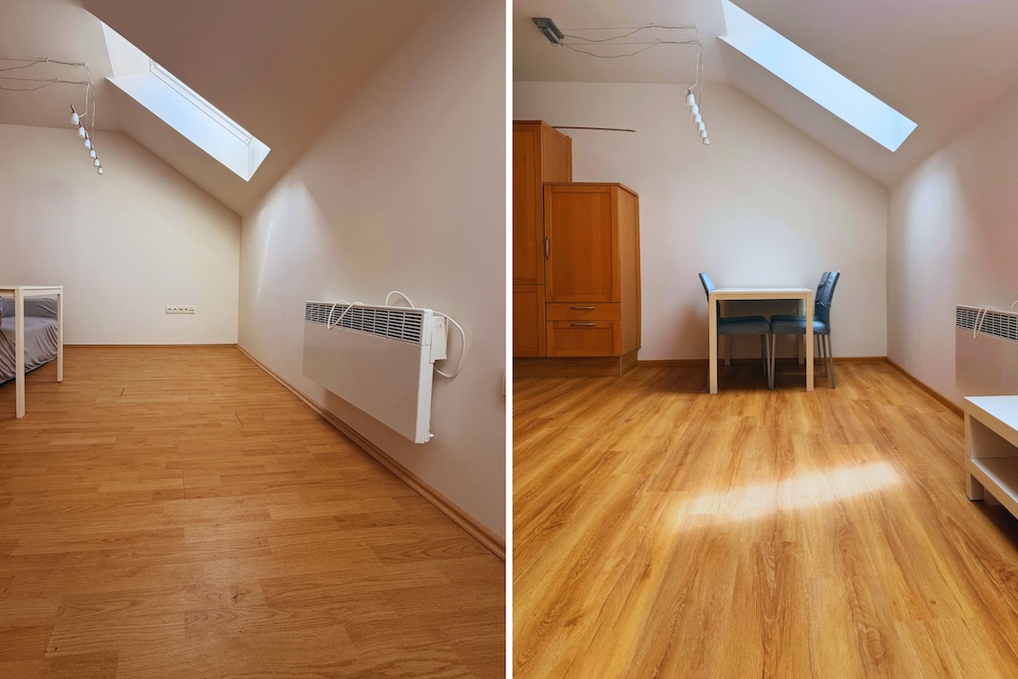 Nejprve jsem vyřešil zarovnání podkladu. Novou podlahu jsem pak položil v opačném směru, aby malý byt působil prostorněji.