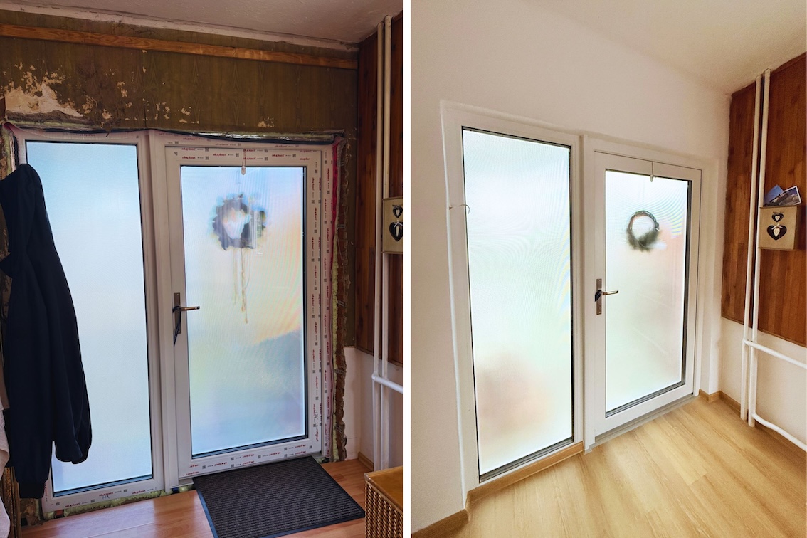 Nakonec jsem spravil prostor pod rámem dveří, zapravil stěny, položil novou podlahu a vše vymaloval, takže vstup nebyl jen funkční, ale skutečně dokončený.